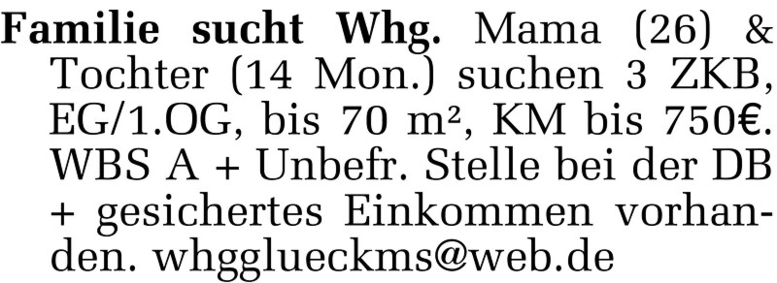 Familie sucht Whg. Mama ( 26 ) & Tochter ( 14 Mon. ...