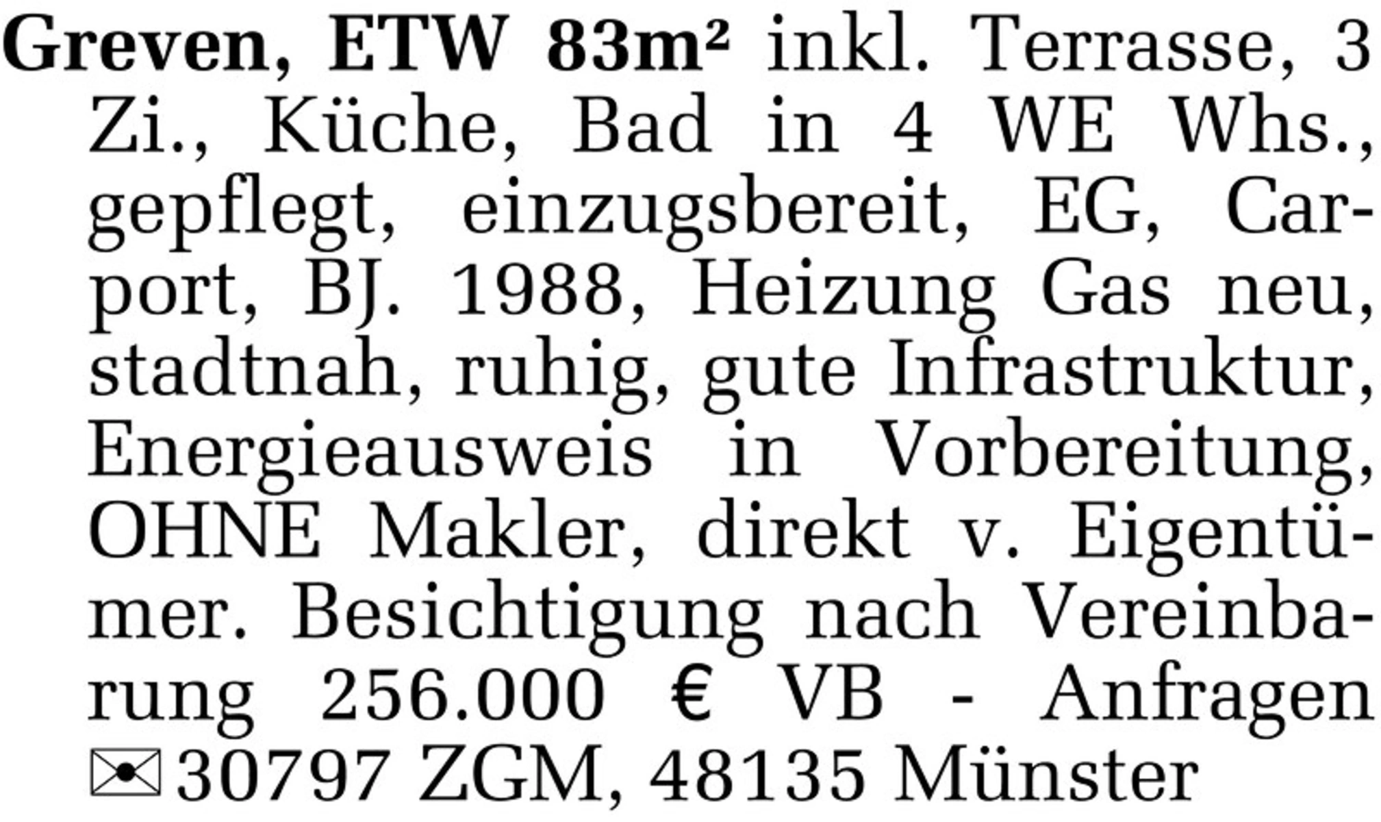 Greven, ETW 83m² inkl. Terrasse, 3 Zi., Küche, Bad ...